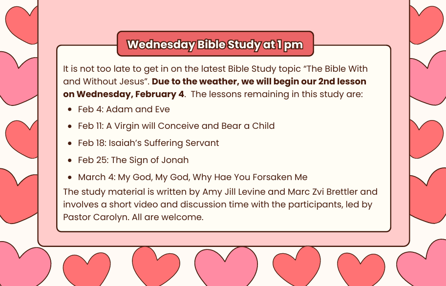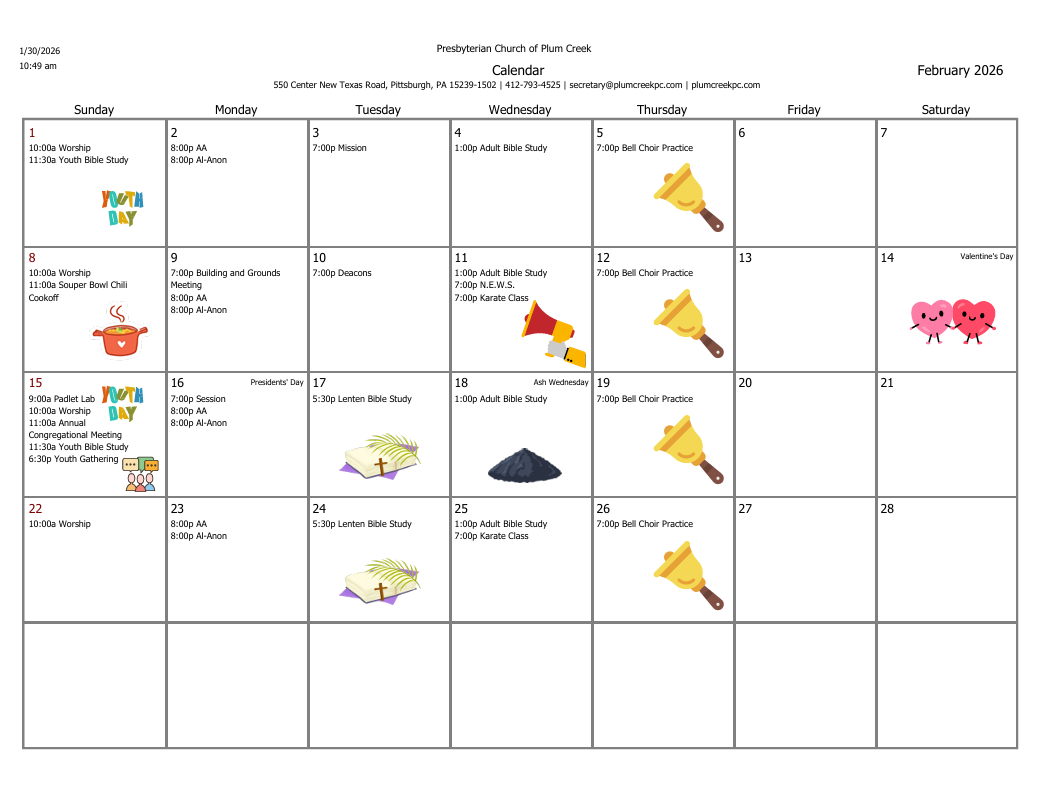 February 2026 Plum Creek Presbyterian ChurchJanuary 30, 2026 Facebook0 Twitter LinkedIn0 Reddit Tumblr Pinterest0 0 Likes