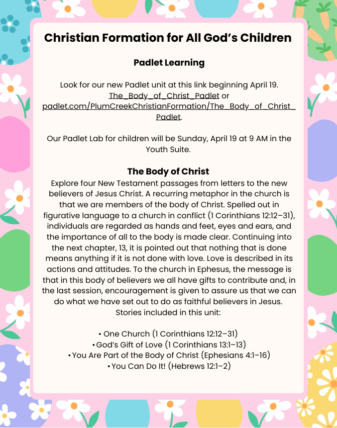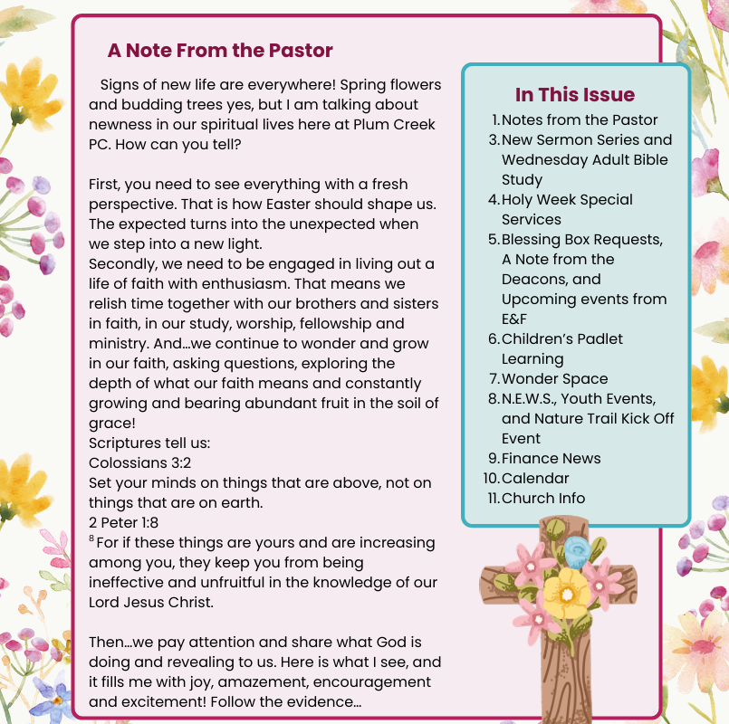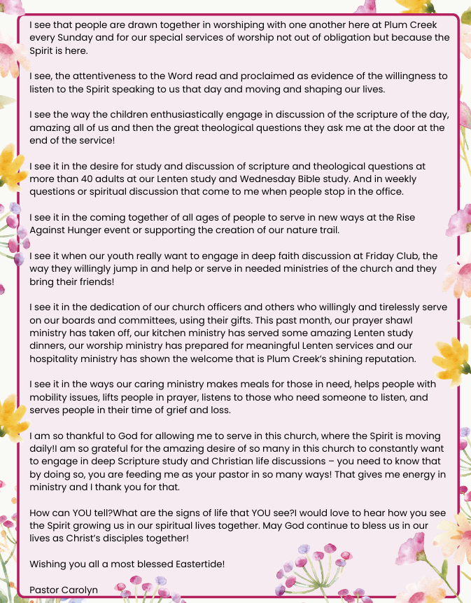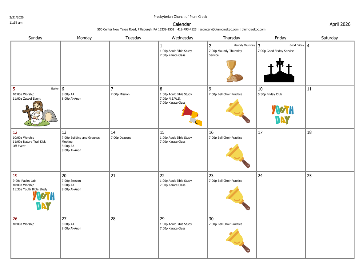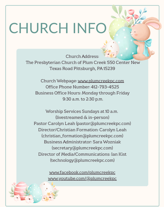 April 2026 Plum Creek Presbyterian ChurchApril 1, 2026 Facebook0 Twitter LinkedIn0 Reddit Tumblr Pinterest0 0 Likes
